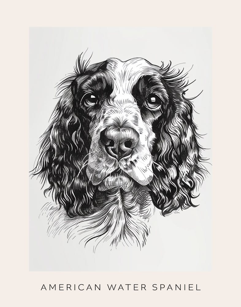 A meticulously detailed line sketch captures the soulful gaze and expressive fur of an American Water Spaniel. Rendered in classic black and white, the drawing highlights the breed's unique features with elegance and precision. It’s a sophisticated and heartfelt tribute to a beloved companion, timeless in its simplicity.