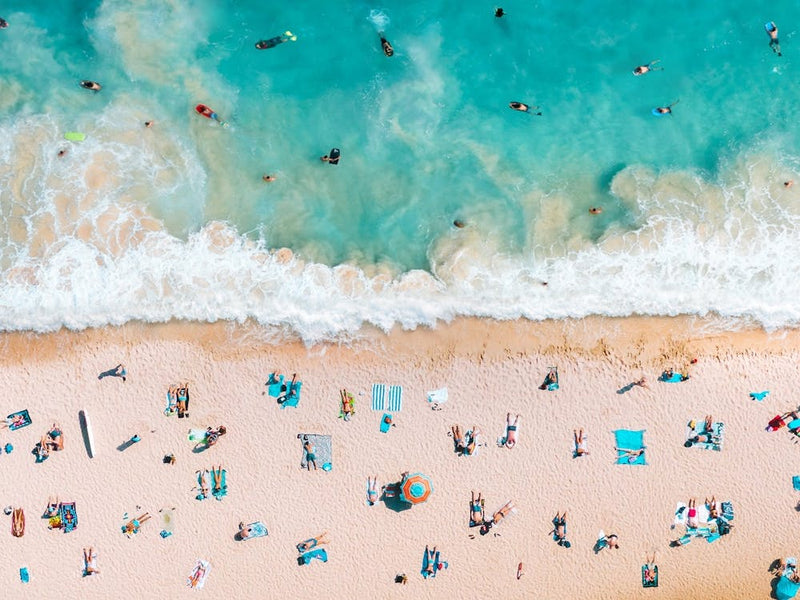 Une vue aérienne capture le pouls vibrant d'une journée d'été à la plage. Les eaux turquoise clapotent sur le sable doré, parsemé de minuscules silhouettes se prélassant au soleil ou s'éclaboussant dans les vagues. La perspective évoque un sentiment de liberté et d'évasion joyeuse, un souvenir parfait du bonheur en bord de mer.