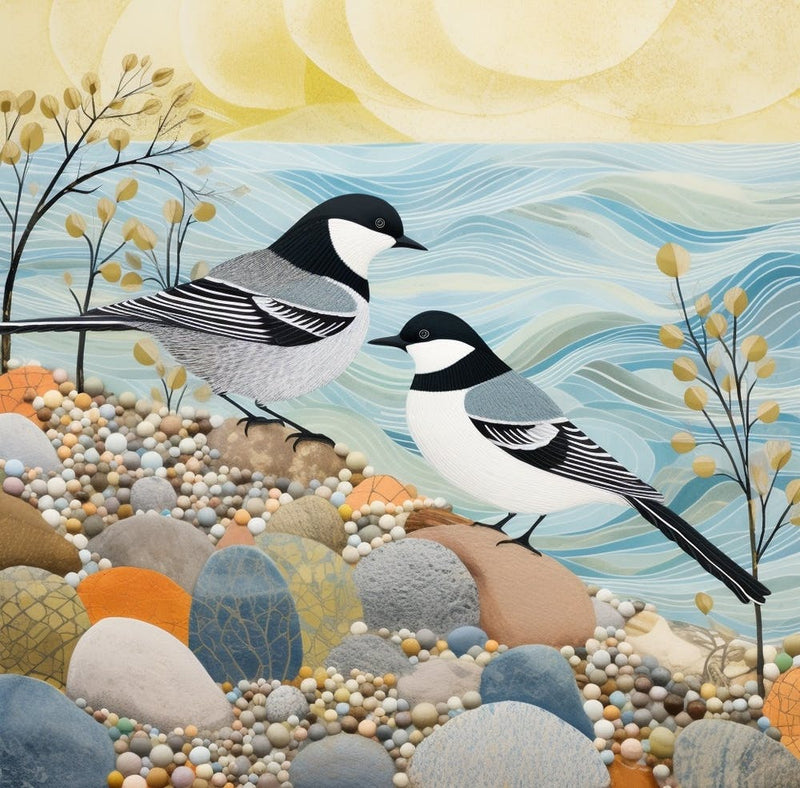 Deux oiseaux stylisés se perchent sur une rive parsemée de galets, leurs formes noires et blanches contrastant avec le bleu doux et ondulant de l'eau. L'œuvre, avec son aspect texturé, semblable à un collage, évoque une connexion fantaisiste et douce avec la nature. C'est un instantané tranquille de la vie au bord de la rivière.