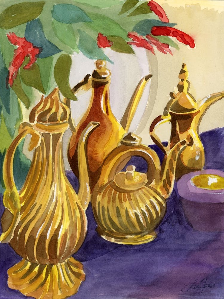 Une collection de théières en laiton ornées brillent de reflets riches et chauds, posées sur un drap violet vibrant et un feuillage vert luxuriant. La technique de l'aquarelle leur confère une texture douce mais riche, soulignant leurs formes classiques. C'est une charmante nature morte, évoquant des rassemblements douillets et la beauté intemporelle de trésors de famille dans un cadre bohème.