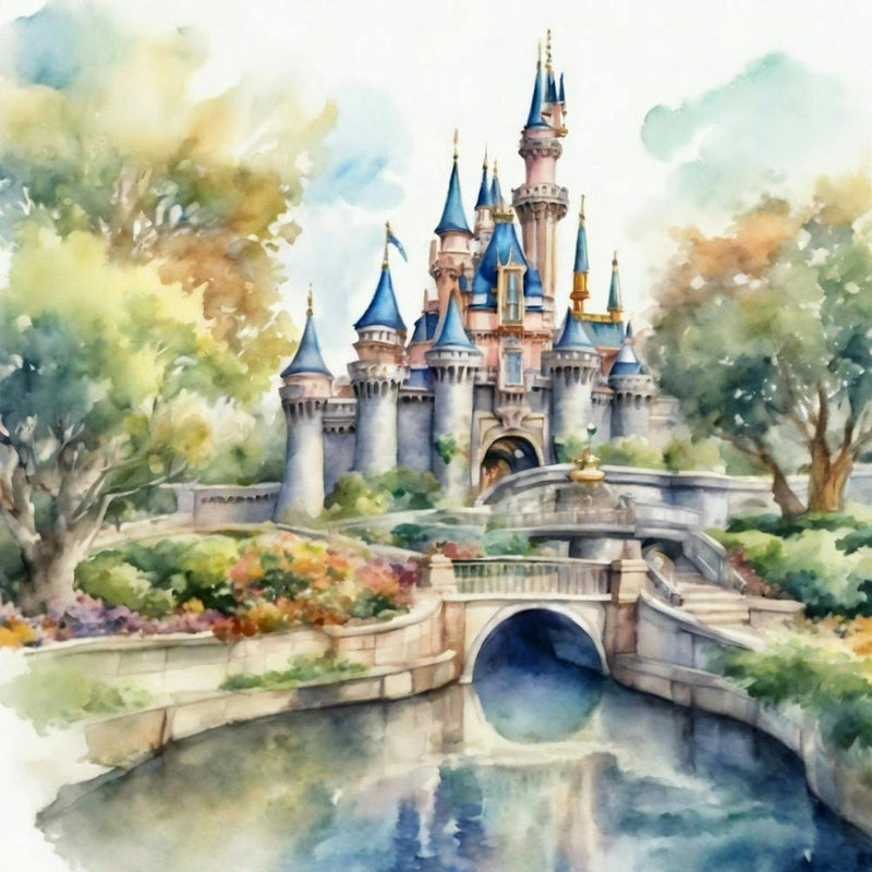 Un château de conte de fées s'élève d'un paysage luxuriant, rendu dans des aquarelles douces et oniriques, se reflétant délicatement dans des douves sereines. Des éclats de magie scintillent autour de ses flèches, évoquant les rêves d'enfance et une merveille nostalgique. Il capture l'esprit joyeux d'une fantaisie aimée, baigné d'une lueur fantaisiste.