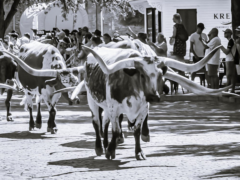 Des bovins Longhorn déferlent dans une rue du centre-ville, leurs cornes massives traversant un arrière-plan d'architecture urbaine. Cette photographie en noir et blanc capture la puissance brute d'une époque révolue, une pièce vivante de l'histoire de Fort Worth. Elle résonne avec l'esprit de l'Ouest américain, préservé dans un moment urbain puissant.