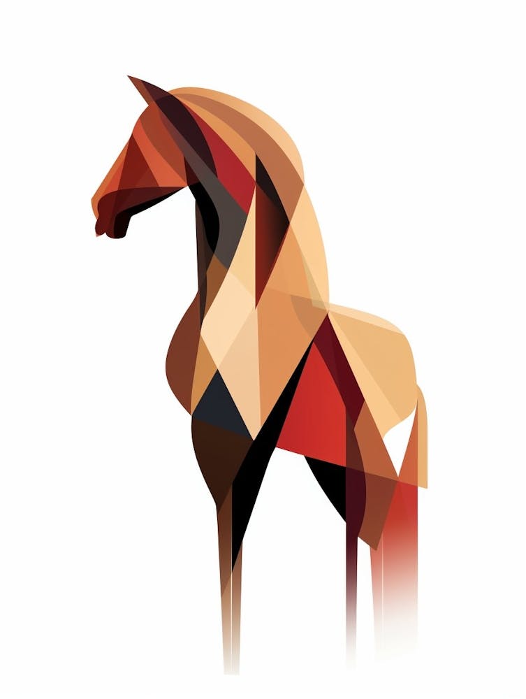 La forme puissante d'un cheval est réinventée à travers des plans géométriques qui se croisent, peints dans une palette de bruns terreux, d'oranges et de rouges chauds. Les lignes épurées et les formes angulaires créent une silhouette dynamique mais minimaliste. C'est un hommage sophistiqué et moderne à la grâce et à la force équines.