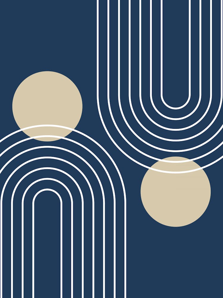 Des arches élégantes et courbées et des cercles parfaits dans un bleu marine et beige serein définissent cette abstraction géométrique moderne du milieu du siècle. Les lignes épurées et la palette apaisante évoquent un sens du design intemporel et une sophistication minimaliste. Elle vibre d'un rythme calme et rétro, idéal pour les espaces recherchant une élégance discrète.