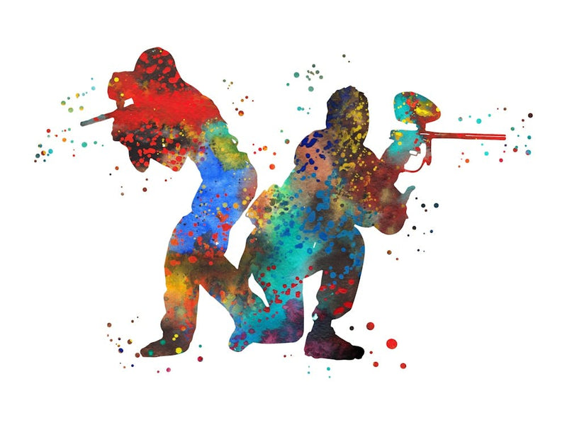 Deux joueurs de paintball ombragés sont rendus dans une explosion d'éclaboussures d'aquarelle vibrantes, capturant l'énergie explosive du jeu. Des éclaboussures dynamiques de peinture rouge, bleue, verte et jaune suggèrent une action intense et un mouvement rapide. C'est une œuvre énergisante et audacieuse qui transmet vivement le frisson du sport de compétition, une touche d'adrénaline sur toile.