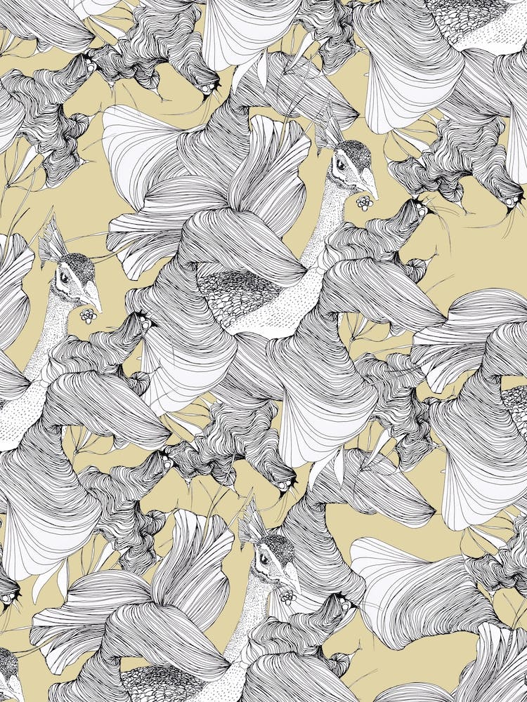 Un motif complexe et fluide de paons s'entrelace sur une toile beige sourde. Leur plumage est rendu en lignes noires et blanches complexes, créant une texture hypnotique, presque onirique. C'est une célébration du détail et de la forme organique.