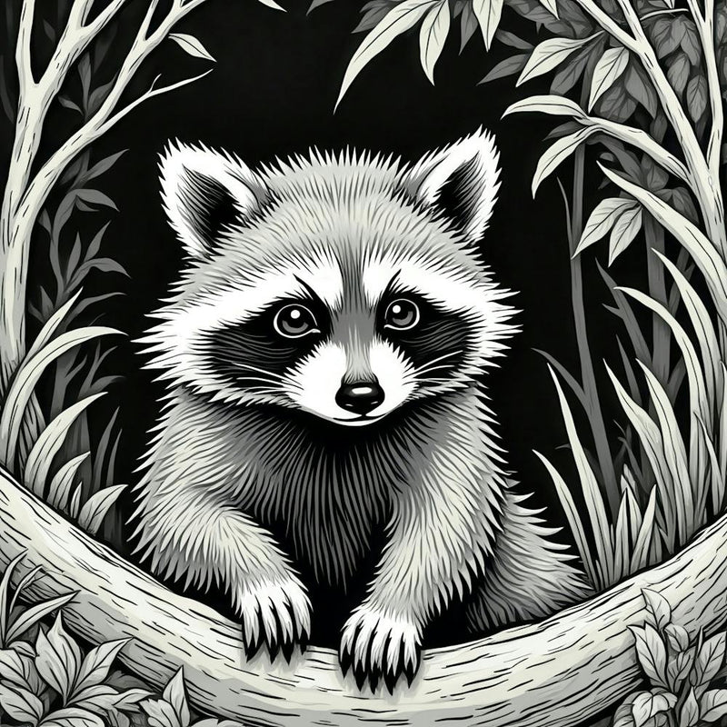 Un raton laveur curieux observe depuis sa cachette boisée, son masque distinctif contrastant de manière saisissante avec le délicat trait des feuilles environnantes. Rendue en noir et blanc classique, cette illustration capture le charme innocent de la faune des bois. C'est une image douce et captivante qui apporte la magie tranquille de la forêt à l'intérieur.
