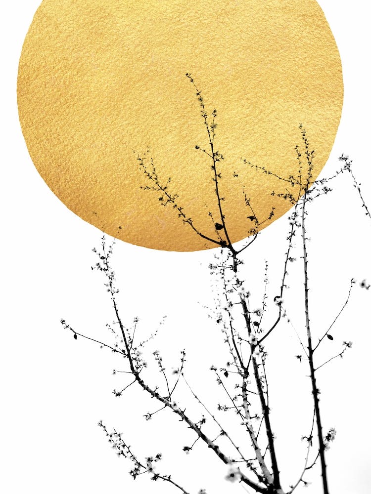 Un disque doré radiant, texturé comme du métal martelé, est suspendu au-dessus de délicates branches botaniques noires. Le contraste saisissant avec un fond blanc immaculé crée une composition minimaliste puissante mais sereine. Elle incarne l'élégance discrète des formes simples de la nature et la douce chaleur de la lumière.