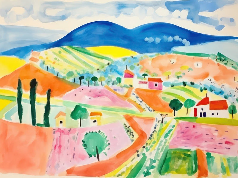 Les collines toscanes vallonnées prennent vie dans un rêve fantaisiste à l'aquarelle, peintes avec des teintes vibrantes et ludiques et parsemées de petites maisons et de cyprès élancés. Cette charmante illustration capture la joie idyllique de la campagne italienne, une évasion légère dans un paysage pittoresque.