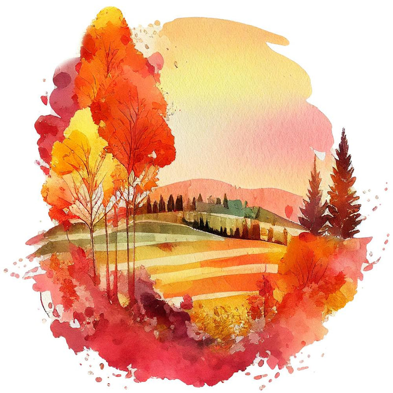 Une aquarelle circulaire dépeint un paysage d'automne invitant, où des arbres flamboyants de rouges ardents et de jaunes chauds se dressent sur des collines ondulantes. Les lavis doux capturent la lueur dorée d'un soleil caché et l'air vif de la saison. Cette pièce évoque un sentiment réconfortant de nostalgie et la beauté sereine de l'étreinte de l'automne.