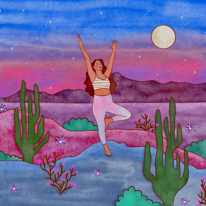 Sous un ciel désertique étoilé et éclairé par la lune, une silhouette solitaire trouve un équilibre serein dans une pose de yoga. Des cactus vibrants et de minuscules fleurs parsèment le paysage, rendus en aquarelles douces et oniriques. Cette œuvre évoque un espace tranquille pour la pleine conscience, où l'énergie cosmique rencontre la puissance silencieuse de la terre.