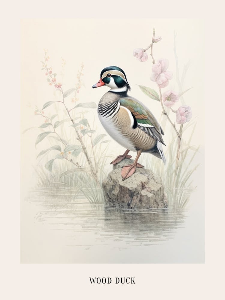 Vintage Bird Drawing Wood Duck 2 Poster -