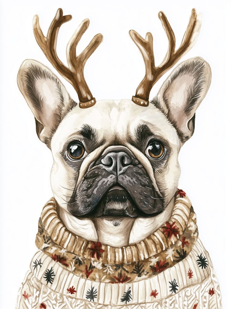 French Bulldog In Christmas Jumper And Antlers Neutral -