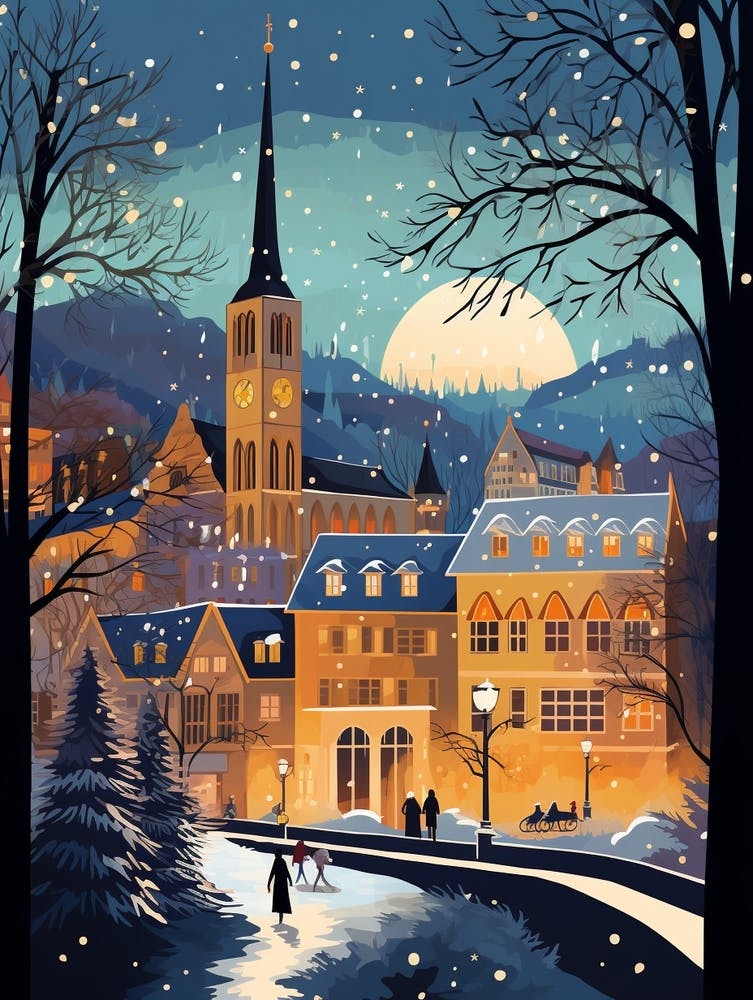 Winter Travel Night Illustration Zurich Switzerland 6 -