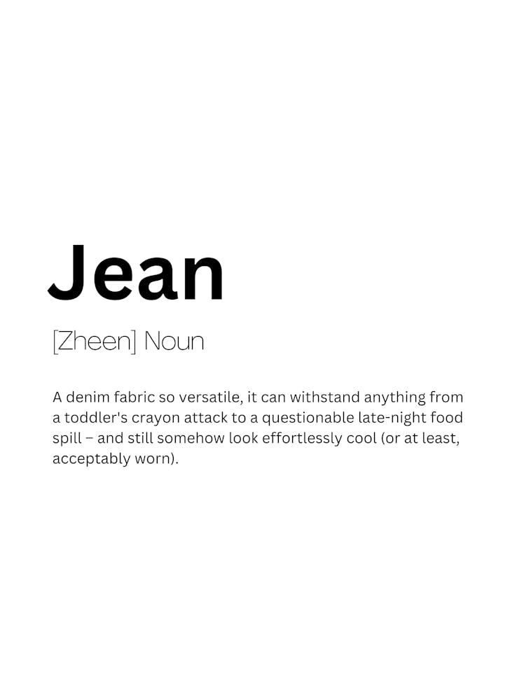 A crisp, minimalist definition of "Jean" is presented in stark black text on a clean white background. It humorously describes the resilience and effortless cool of denim fabric. This artwork offers a playful nod to everyday comfort and style, embodying a clean, contemporary aesthetic with a touch of wit.