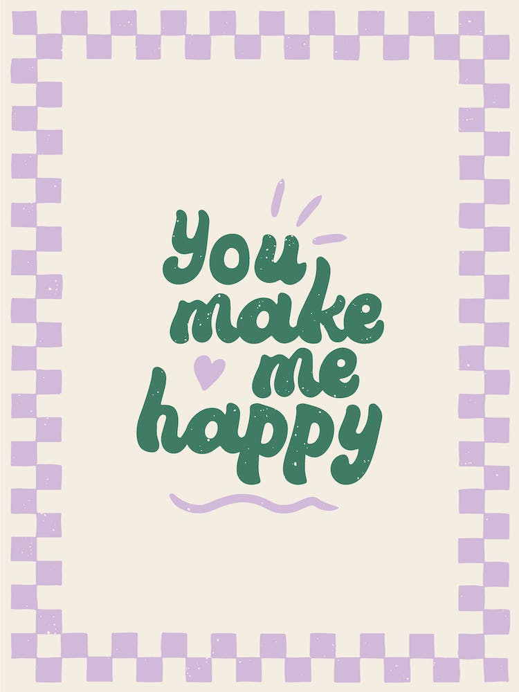 Bold, bubbly green lettering declares 'You make me happy' against a creamy background, framed by a playful lavender checkerboard. A small heart punctuates the message, radiating simple, undeniable joy. The composition feels lighthearted and sincere, a visual high-five meant to brighten any space and mood.