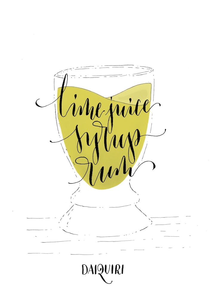 A crisp line drawing defines a classic daiquiri glass, its contents hand-lettered: "lime juice, syrup, rum." Below, "DAIQUIRI" announces the iconic cocktail. This piece celebrates the art of mixology with elegant simplicity, perfect for a modern bar area or kitchen.