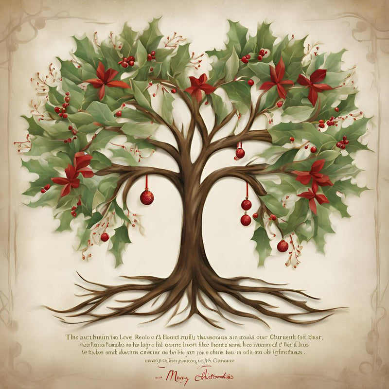 A beautifully rendered holly tree, adorned with red bows and berries, roots firmly in the earth. Its lush green leaves and festive ornaments evoke a sense of warmth and tradition. The subtle aged texture of the background hints at a timeless, comforting holiday spirit, a visual carol of peace and joy.