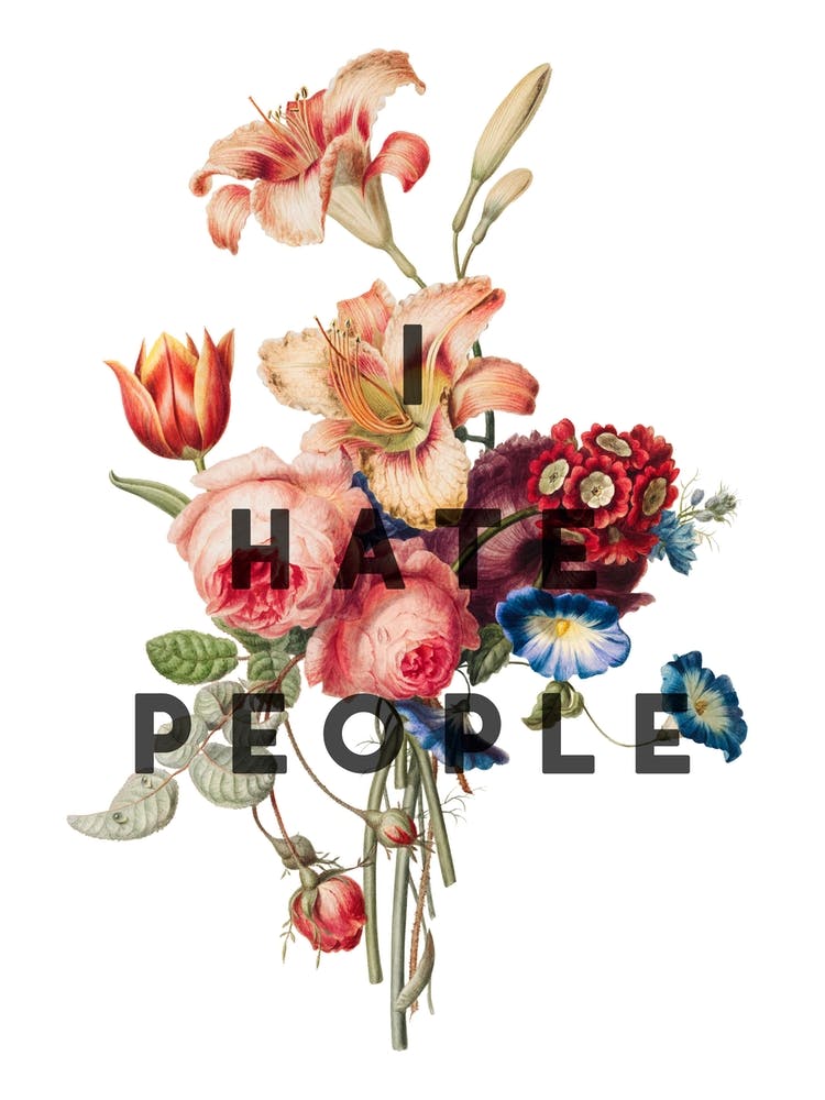 Bold, stark text declaring 'I Hate People' overlays a delicate, antique bouquet of blooming flowers. This artwork presents an ironic juxtaposition, marrying a blunt, humorous sentiment with tender botanical beauty. It's a cheeky, expressive piece for those who appreciate wit with a touch of charm.