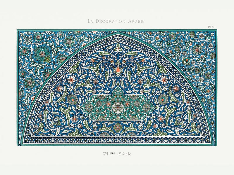 An exquisite arch of intricate Arabesque patterns unfolds, a tapestry of geometric precision and flowing botanical motifs in jewel tones. This historical illustration by Émile Prisse d'Avennes transports the viewer to a world of sophisticated design and cultural richness. It evokes a sense of ancient craftsmanship, a mesmerizing rhythm of shapes and colors.