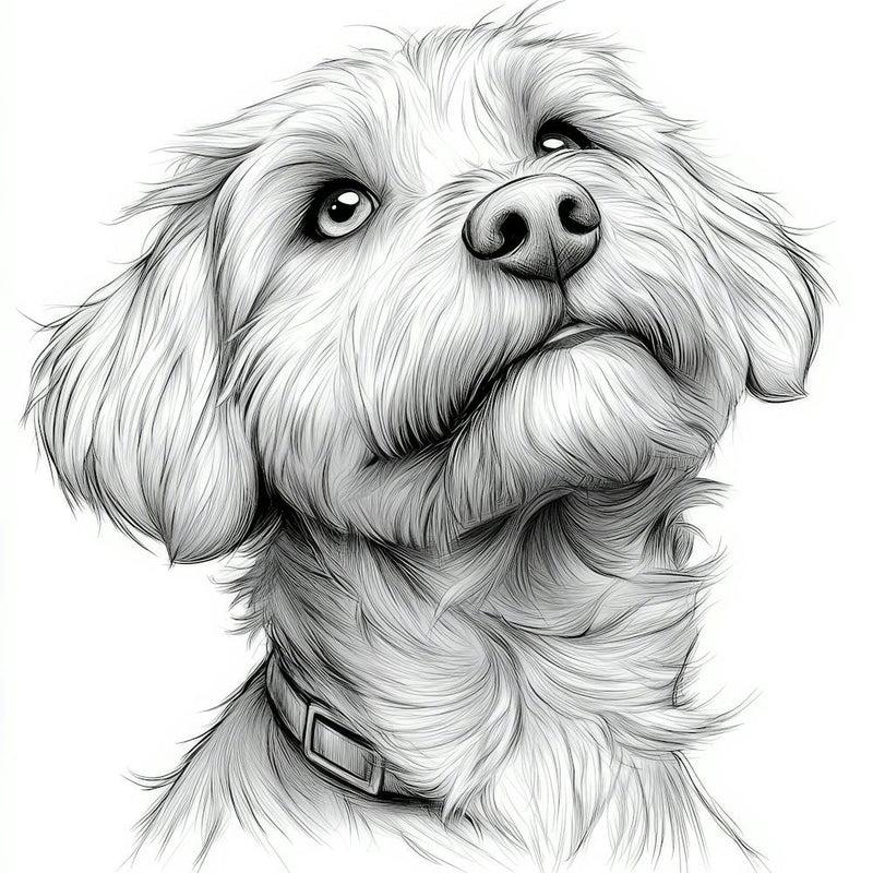 A fluffy Labradoodle gazes upwards with wide, soulful eyes, its head tilted in an expression of gentle curiosity. Every strand of fur is meticulously rendered in fine pencil lines, giving texture and warmth to this charming portrait. This drawing captures the innocent joy and loving spirit of a beloved companion.