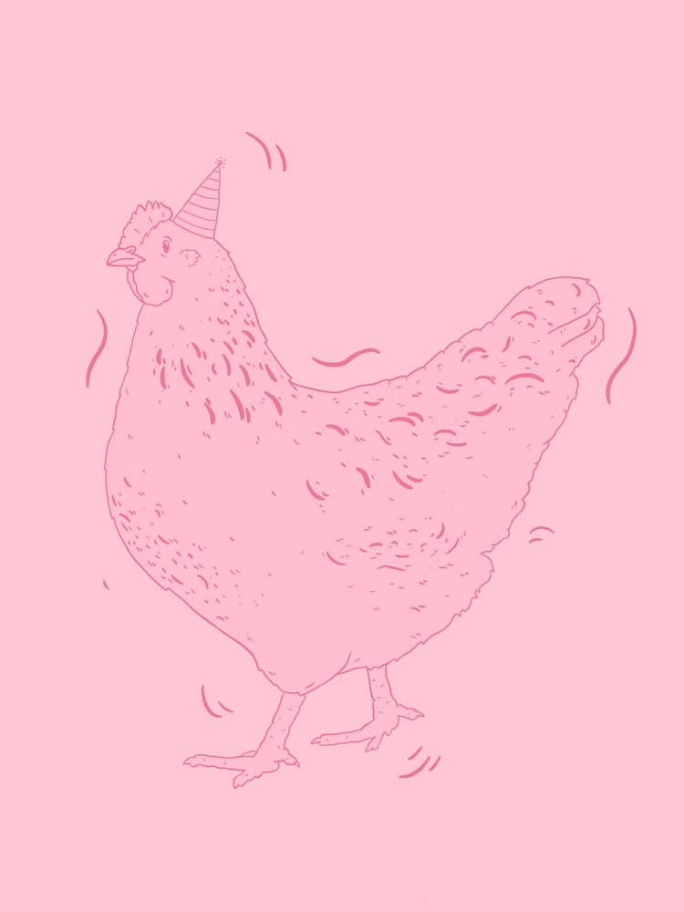 A spirited pink chicken, adorned with a party hat, stands with a playful wiggle, suggesting a lively "Ladies Night." The minimalist line art on a vibrant pink background creates a bold, humorous statement. This artwork is a celebration of fun and friendship, imbued with a lighthearted, whimsical charm.