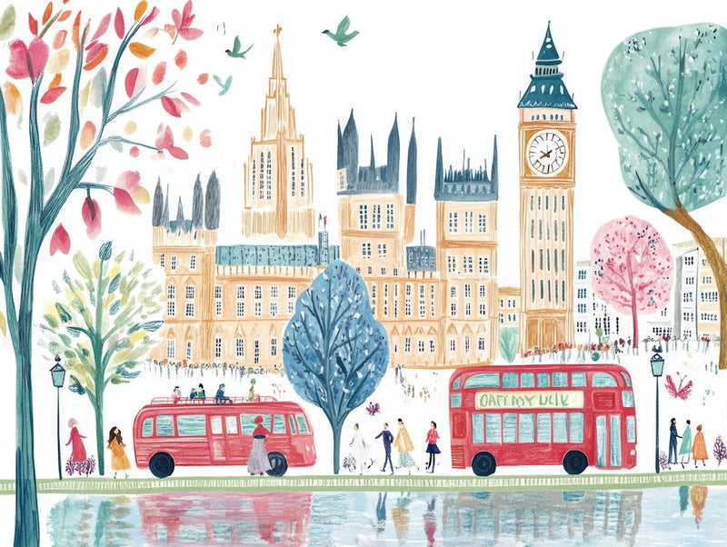 A whimsical watercolor captures the iconic London skyline, with Big Ben and the Houses of Parliament rising above the Thames. Red double-decker buses, tiny figures, and soft-hued trees create a charming, nostalgic scene. It evokes the gentle enchantment of a spring day in the British capital.