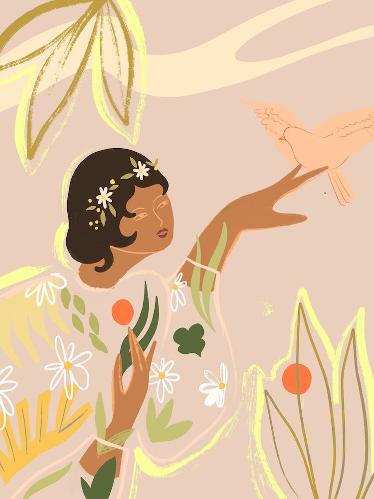 A serene woman, crowned with blossoms and draped in foliage, extends her hand to a gentle bird, creating a tableau of harmonious connection with nature. The muted, earthy palette and soft lines evoke a tranquil, almost spiritual bond to the natural world. It whispers of peace, growth, and quiet reverence for life.
