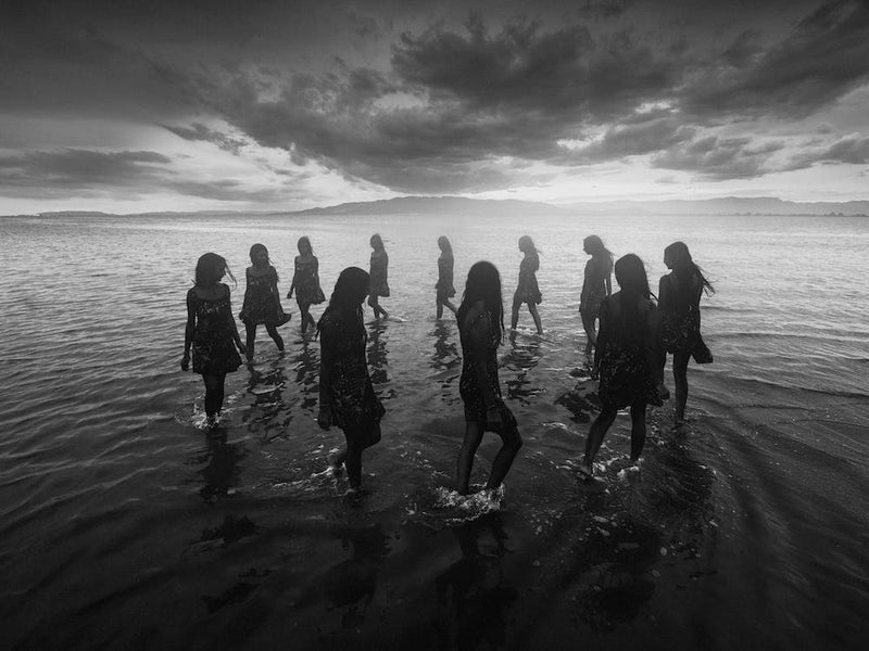 A gathering of silhouettes stands in shallow water beneath a tumultuous sky, their forms creating a visual rhythm across the monochromatic expanse. The water reflects the dark drama above, lending a mysterious, almost ritualistic tone. It's a stark, powerful image that invites contemplation on connection and the elements.