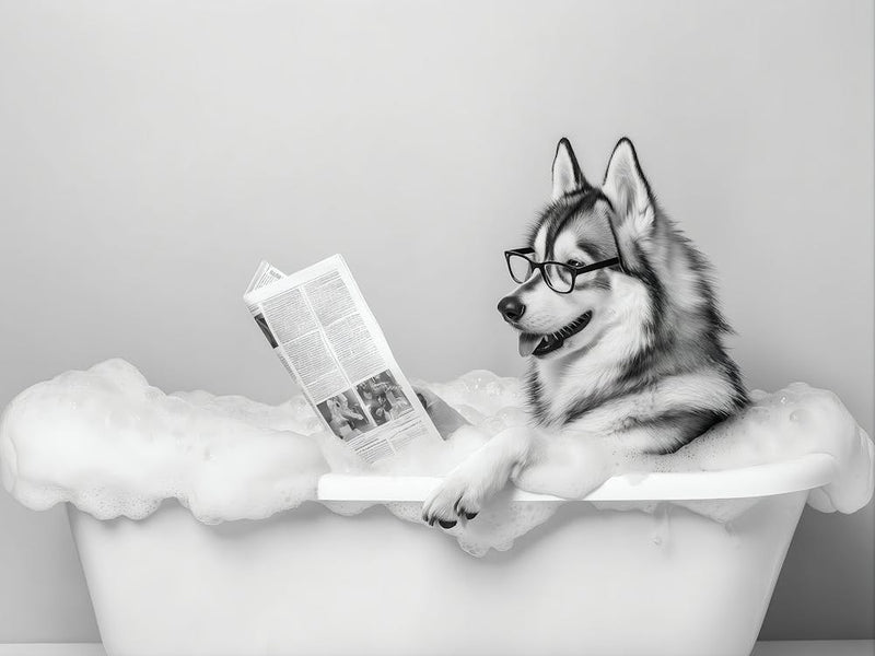 A sophisticated Siberian Husky, spectacles perched on its nose, indulges in a luxurious bubble bath while engrossed in a newspaper. This black-and-white photograph captures a moment of charming absurdity and quiet enjoyment, bringing a dash of whimsical humor to any space. It's a playful twist on daily routines, full of personality.