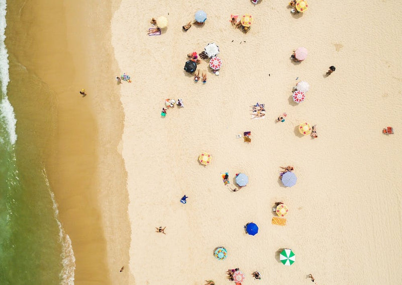 Gulls cry faintly as the turquoise ocean meets the golden sand, an aerial ballet of sun-drenched moments. Tiny figures dot the beach, their colorful umbrellas like scattered jewels against the vastness. It captures the universal allure of a summer day, offering a tranquil escape from above.