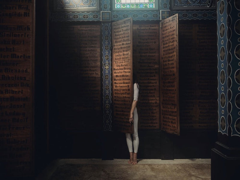 A lone figure, cloaked in white, stands amidst ancient, ornate architecture, partially concealed by towering wooden panels inscribed with history. The scene is imbued with a quiet reverence and profound mystery. It suggests a moment of introspection, where past and present converge within a sacred, echoing space.