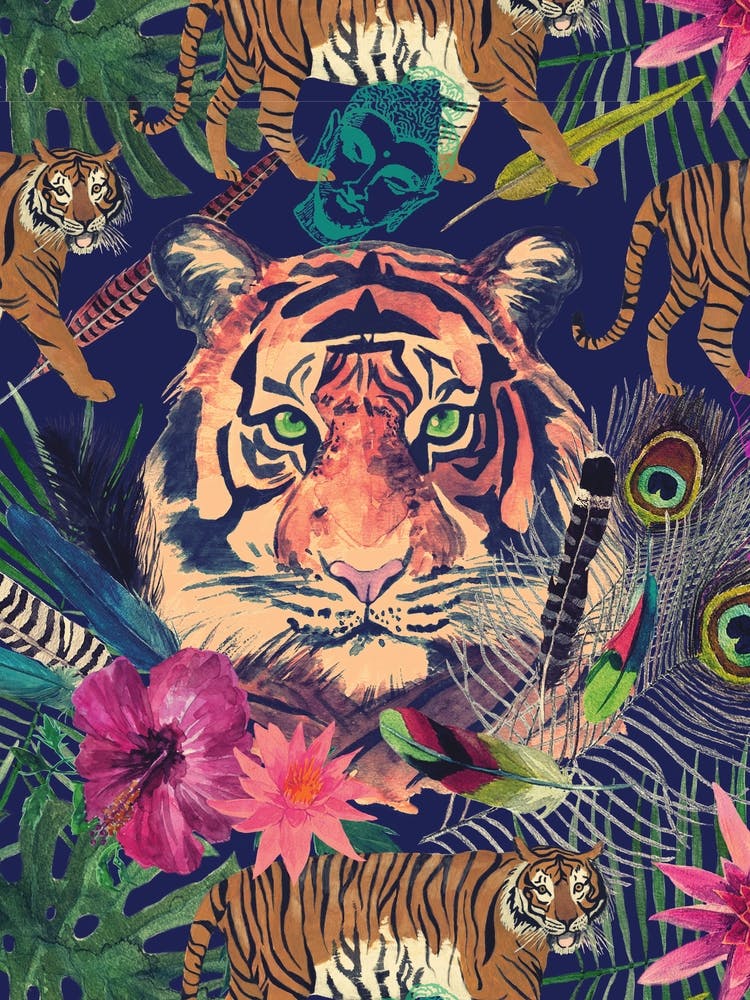 A majestic tiger stares out from a dense, vibrant jungle, surrounded by hibiscus blooms and peacock feathers. Its fierce gaze anchors a swirling tableau of tropical flora. This piece pulses with untamed beauty and the wild, exotic energy of nature's heart.