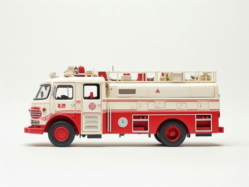 A classic red and white toy fire truck, pristine and ready for adventure, stands against a clean white backdrop. Its ladder extended, every detail of its miniature heroism is captured. It sparks imagination, evoking childhood dreams of brave rescues and endless playtime, a simple charm for young adventurers.