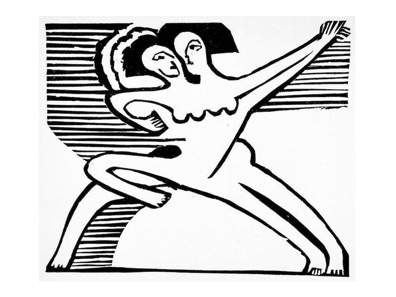 Two stylized figures, rendered in bold black and white, lean into a dynamic dance. Their fluid, abstract forms convey motion and connection, a timeless expression of early modern art. It’s a striking, energetic piece, celebrating the beauty of movement and human form.