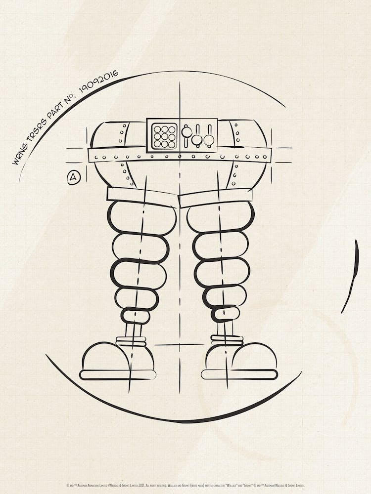 The meticulous blueprint for the infamous 'Wrong Trousers' unfolds, detailing the mechanical marvels designed for canine capers. This charming illustration, rendered in crisp lines on a vintage-toned background, evokes a warm sense of nostalgia and the playful ingenuity of classic animation.