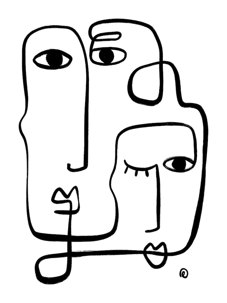 Intertwined black lines dance across a white canvas, forming a collection of abstract faces with fluid grace. The minimalist aesthetic captures the essence of human connection through continuous, elegant strokes. It's a modern meditation on form and expression, bringing quiet sophistication to any space.
