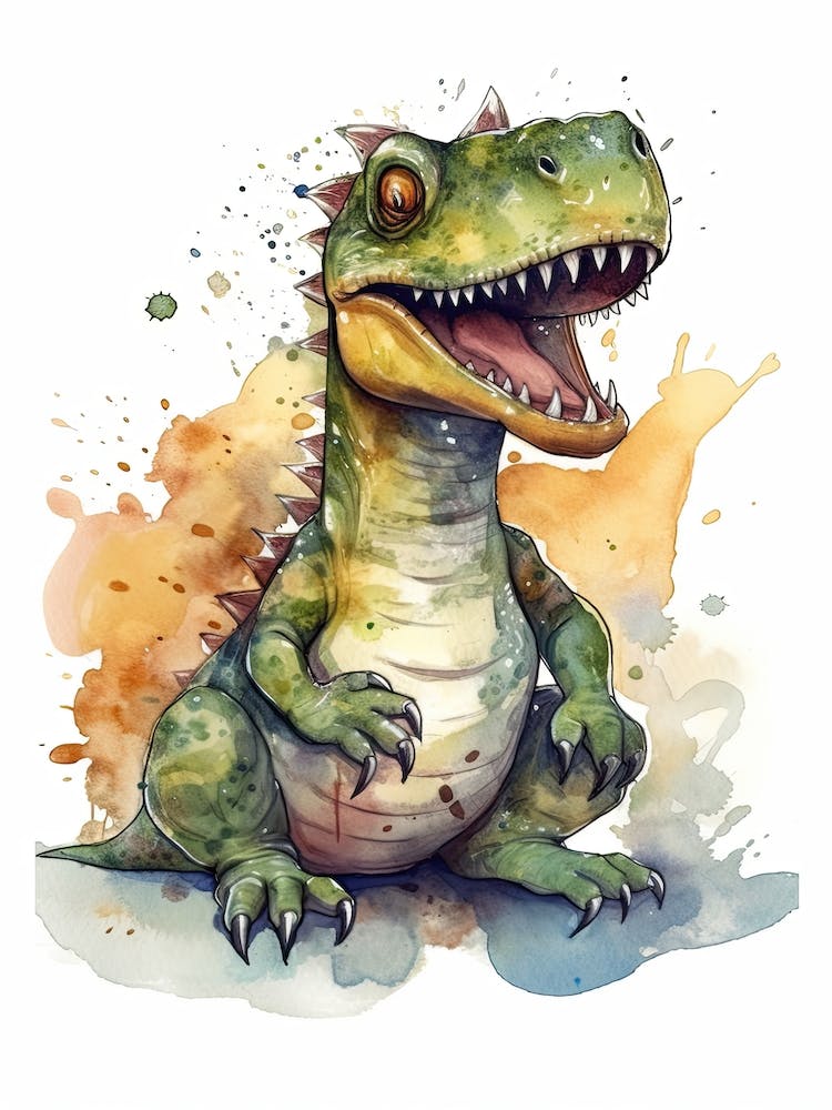 A cheerful, wide-mouthed dinosaur, rendered in lively watercolor splashes, sits with an infectious sense of playful energy. Greens, oranges, and browns bleed softly, giving it a whimsical, approachable pulse. This vibrant illustration brings a touch of prehistoric fun to any room, sparking imagination and joy.