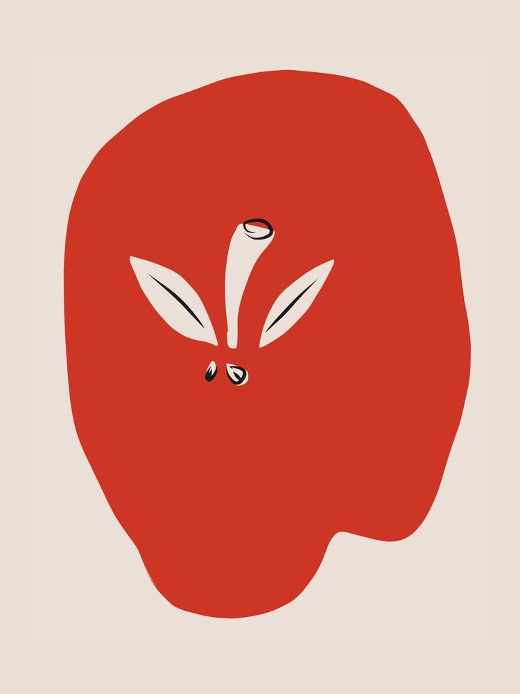 A vibrant, stylized red apple dominates the frame, its form reduced to bold, clean lines. A tiny stem and two delicate white leaves sprout from its center, adding a touch of organic detail to the otherwise abstract shape. This illustration is a playful celebration of simplicity and natural form, a striking pop of color that's both fresh and iconic.
