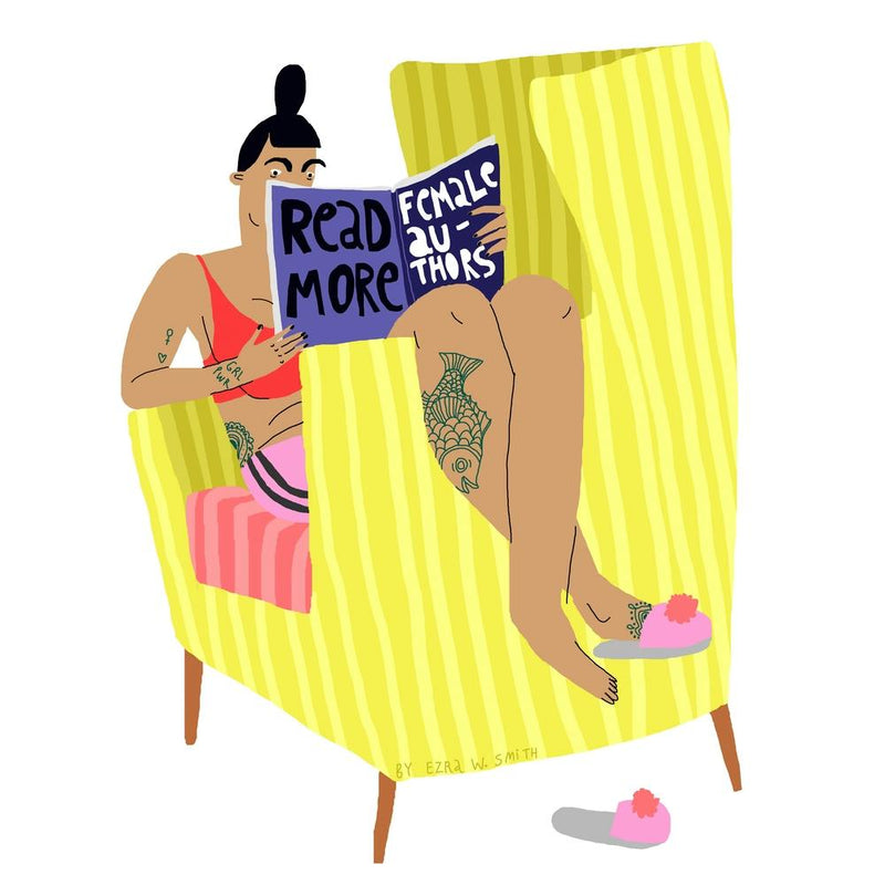 A stylized woman, adorned with intricate tattoos, is absorbed in a book titled 'Read More Female Authors' while comfortably ensconced in a vibrant yellow armchair. This illustration radiates a bold, empowering message, celebrating literature and female voices with a distinct, contemporary artistic flair.