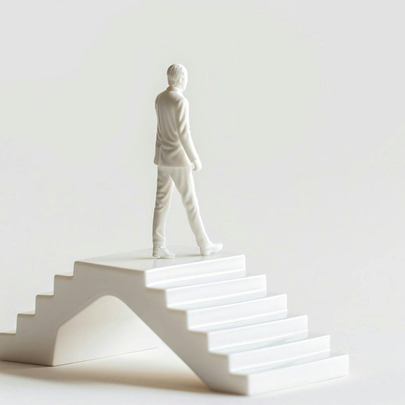 A solitary, white-clad figure ascends a pristine, minimalist staircase against a stark white background. The scene evokes a quiet journey of progress and ambition, the ascent symbolizing steps towards a goal. It's a clean, conceptual image, offering a moment for thoughtful reflection on one's path.