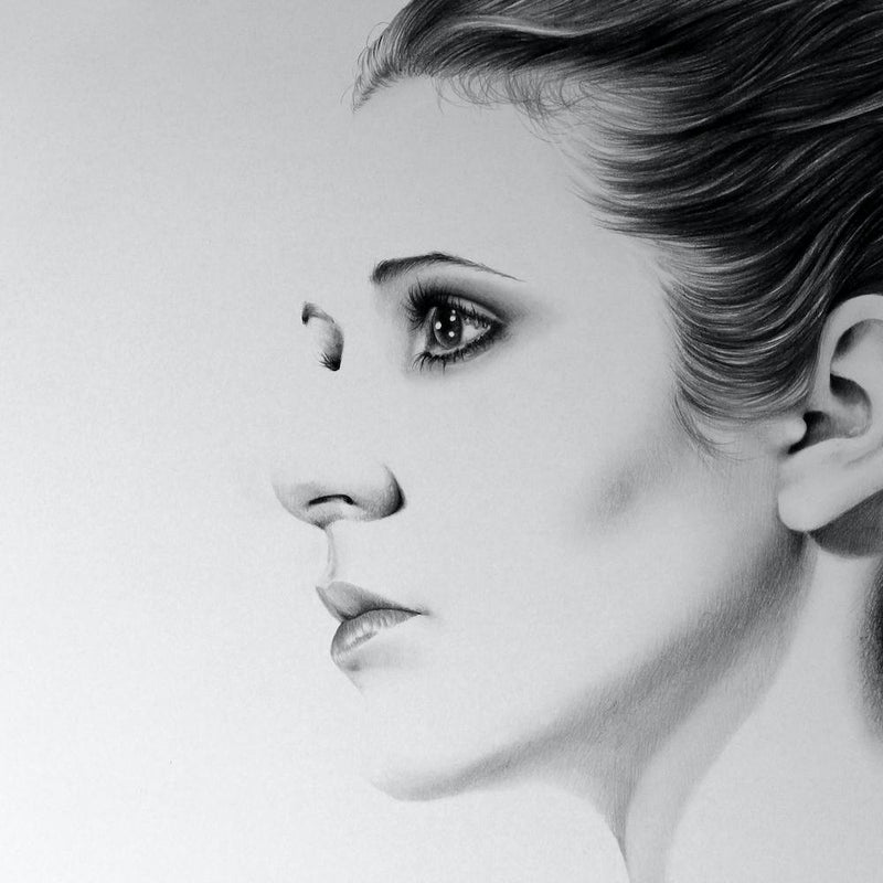 A meticulously rendered graphite portrait reveals a woman’s profile, her gaze thoughtful and distant. A surreal cut-out in the face invites contemplation, hinting at fragmented identity or profound introspection. The monochromatic tones amplify the dramatic intensity, capturing a quiet, powerful mystery within the human form.