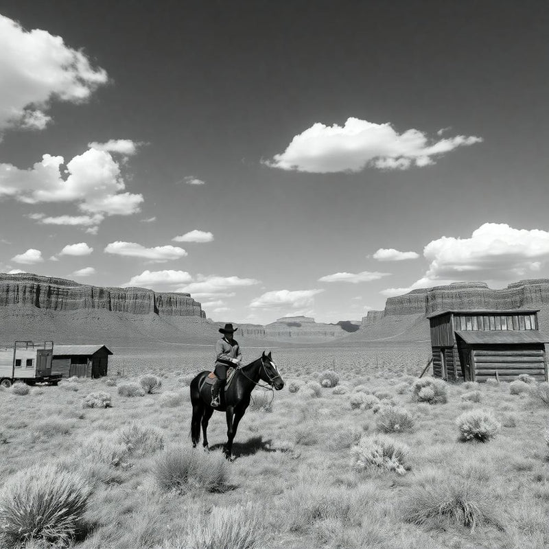 A lone cowboy on horseback stands silhouetted against a vast, cloud-strewn desert sky, surrounded by scrub brush and distant mesas. The stark black and white photography evokes the timeless spirit of the American West, capturing both solitude and rugged determination. This image is a testament to untamed landscapes and enduring legends.