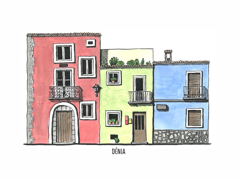 Three colorful buildings, each a unique shade of pink, green, and blue, stand side-by-side, evoking the charm of a Mediterranean town. The hand-drawn lines and cheerful palette capture the sunny, relaxed spirit of coastal European life. This piece brings a joyful, travel-inspired warmth to any interior.