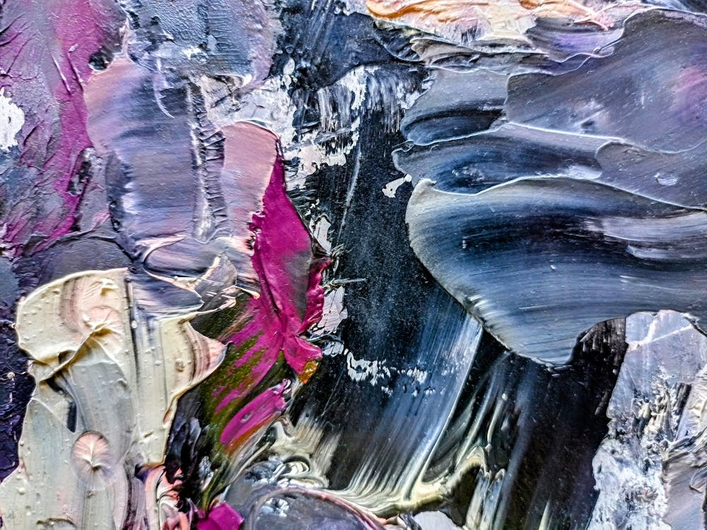 A canvas bursts with thick, impasto strokes in a dramatic interplay of dark blues, purples, and deep blacks, accented by flashes of stark white and fuchsia. The raw texture and intense palette evoke a powerful, tumultuous energy, a visceral expression of raw emotion and underlying mystery.