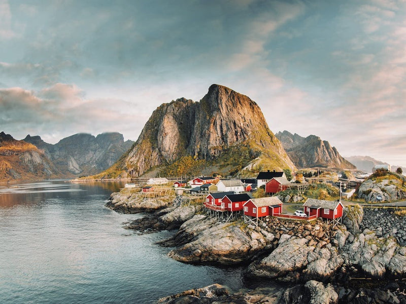 Jagged peaks rise above a tranquil fjord, where a cluster of red-roofed houses cling to the rocky shore. The cool, muted light of a Nordic dawn illuminates the dramatic landscape, casting long shadows over the water. It evokes a profound sense of peace and the raw, untouched beauty of nature's grandeur.