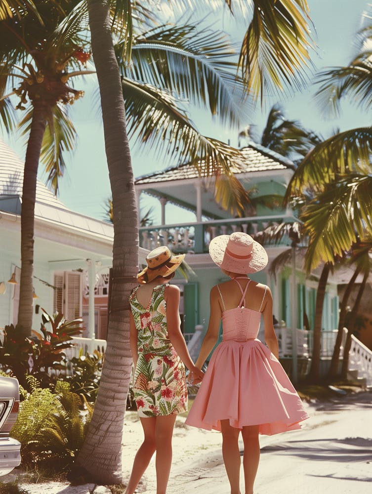 Two friends stroll hand-in-hand beneath swaying palms, their backs to us as they embrace a sun-drenched tropical escape. The vintage-inspired palette and effortless style evoke a timeless sense of freedom and joyful companionship. It captures the essence of a perfect, carefree vacation day.