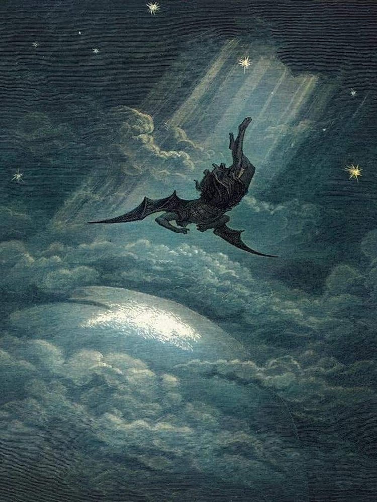 A dark, winged figure plummets through turbulent, star-dusted clouds, illuminated by shafts of divine light. Gustave Doré's masterful illustration from Paradise Lost captures the dramatic descent, evoking ancient power and ethereal menace within a richly detailed celestial canvas.