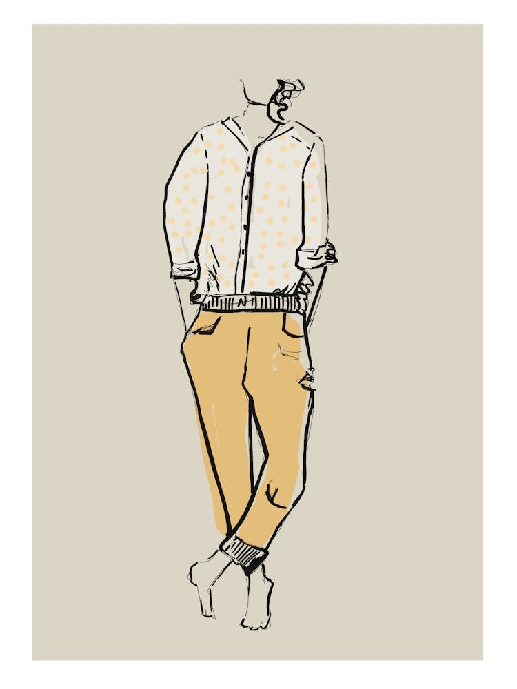 A casually dressed figure stands with hands in pockets, rendered in simple, gestural lines against a muted beige background. Splashes of pale yellow and muted brown define her clothing, adding warmth to the sketch-like quality. This artwork evokes a quiet, contemplative mood, a relaxed moment of self-possession in an understated, approachable style.