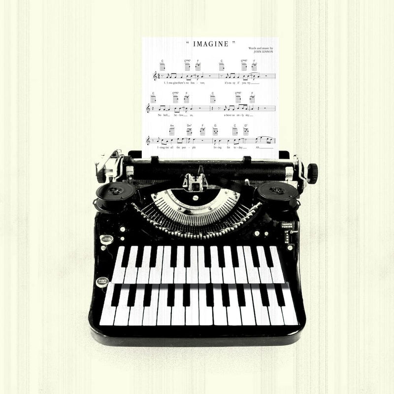 A vintage typewriter merges ingeniously with a piano keyboard, creating a harmonious blend of classic communication and musical expression. A sheet of 'Imagine' by John Lennon rests above, lending a poignant, timeless message. This piece celebrates creativity, peace, and the enduring power of art and music.